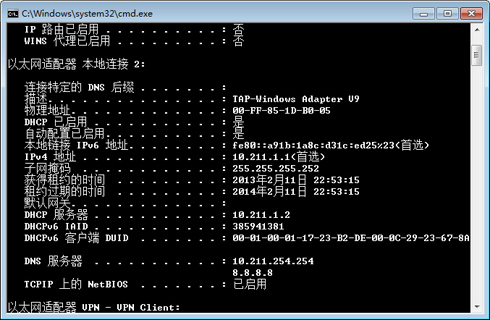 虽然建立了 VPN 连接,在 Windows 上将创建一个虚拟网络适配器,该适配器将被分配一个以 "10.211" 开始的 IP 地址。默认网关地址将被指定在虚拟网络适配器上。您可以在 Windows 命令提示下运行 "ipconfig / all" 命令,确认这些网络配置。